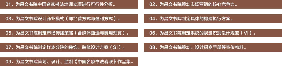 第六,我们提出了 “名家艺术产业链” 的企业经营战略。制定了开创名家书法培训机构“昌文书院”的完整策略。首创名家书法教学+书法用品研、产、销+名家书画作品展销+名家书画作品拍卖+名家书画作品出版发行,这一“名家艺术产业链”经营模式。至此,黎总所领导的企业不再是困境中研、产、销春联的小工厂,而是一家有格局的国粹文化系统运营商。